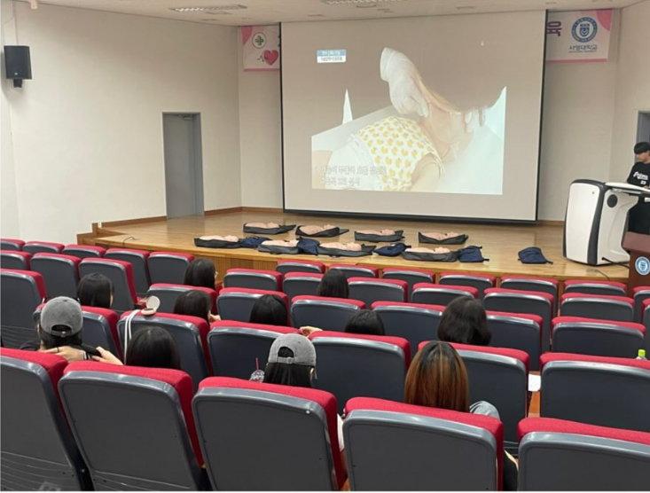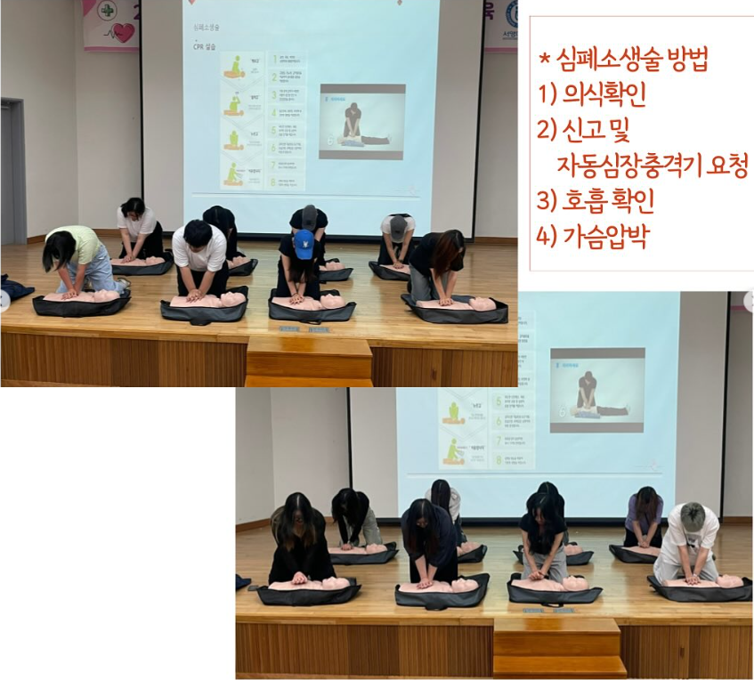- 일시 : 2024년 6월 19일- 대상 : 유아교육과 2, 3학년- 장소 : 서영대학교 서강홀- 내용 : 유치원 정교사 자격취득을 위한 필수교육 중 하나인 심폐소생술 교육을 실시하였습니다. 안전사고 발생 시 대처방법에 대한 이론과 더불어 더미를 이용한 실습을 통해 위급상황에서 신속하고 정확하게 대처하는 방법에 대해 배워보는 의미있는 시간이었습니다.
