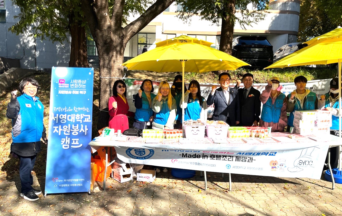 ○이날 우리대학 호텔조리제빵과 재학생들이 직접 만든 초코머핀,스모어 쿠키 등으로 구성된300개 다과 세트를 지역 주민과 청소년들에게 나눠줬다.또 호텔조리제빵과 학생들은 조리,제과제빵 등에 관심을 가진 청소년들을 대상으로 진로 상담을 펼치기도 했다.