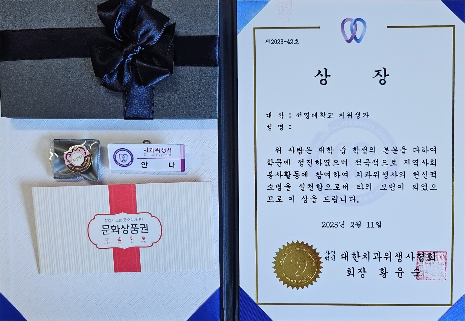 2025학년도 대한치과위생사협회 협회장상을 수여받았습니다 ^^ 축하합니다.