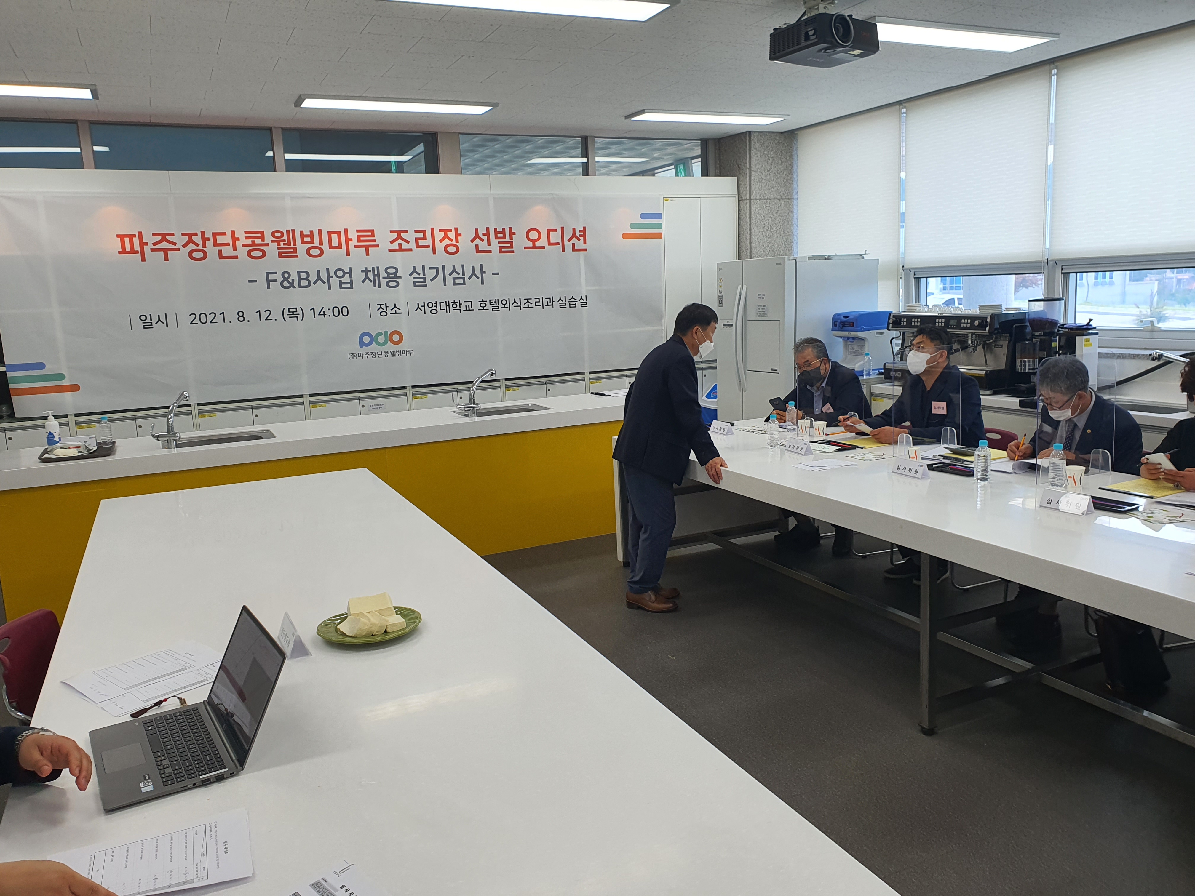 파주장단콩웰빙마루 조리장 선발 오디션을 8월 12일(목) 14시부터 서영대 호텔외식조리과 실습실에서 진행되었다. 파주장단콩웰빙마루는 파주시 출자기관으로 파주시 탄현면 성동리에 18,000평 규모를 자랑한다. 파주시민의 기업으로서 농가소득 증대 및 지역경제활성화에 기여하는 기관이다.