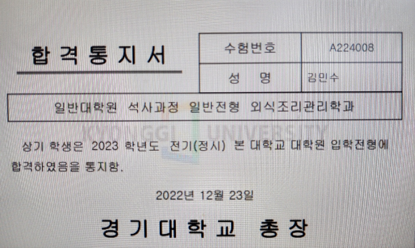 "경기대학교 일반대학원 석사과정 외식조리관리학과 최종 합격"