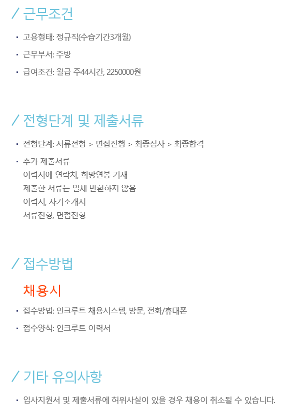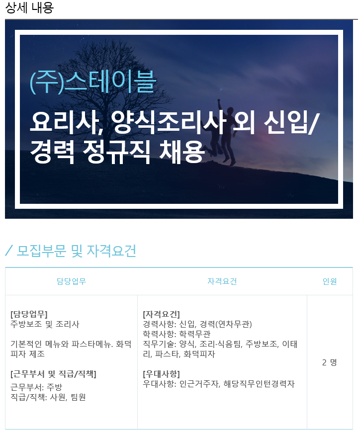 스테이블 요리사, 양식조리사 외 신입/경력 정규직 채용에 대한 상세정보