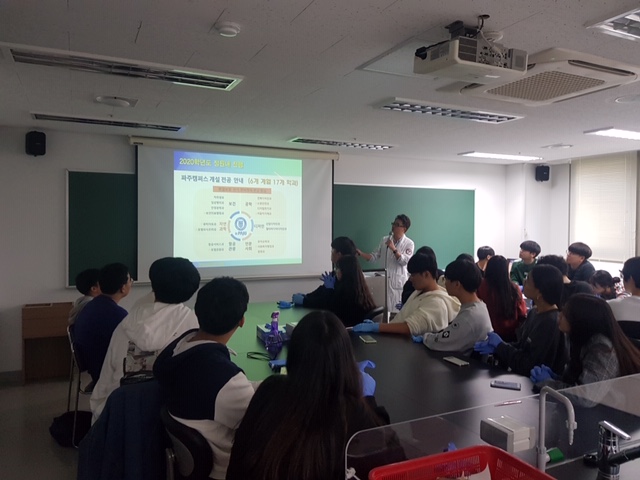 지난 10월 19일(토) 서영대학교 파주캠퍼스 임상병리과는 산학 협약을 맺은 고려대학교 분자진단연구회와 함께 서울시 도봉구 관내 6개 고등학교에서 130여명의 학생들이 참여한 가운데 도봉구와 함께하는 ‘생명과학체험교실’을 개최하였다. 청소년 ‘생명과학 체험 프로그램’은 일반 고등학교의 기자재로는 체험이 어려운 ‘DNA 지문분석 (DNA finger printing)’ 기법등과 같은 실험을 대학교 실험실에서 직접 체험해 볼 수 있도록 하는 기회를 통해 청소년 스스로의 자신의 적성을 찾아가고, 4차 산업혁명에 대응할 수 있도록 하기 위해 마련됐다. 특히, 서영대학교 파주캠퍼스 임상병리과 이지웅 학과장은 “바이오, 인공지능, 빅데이터, 의생명과학 등의 융합이 어우러지는 4차 산업혁명 시대를 맞이하면서 학생들이 직접 다양한 실험을 경험 할 수 있는 ‘청소년 생명과학 체험 프로그램’을 통해 과학기술을 선도할 수 있는 인재로 성장하는 기회가 되길 바란다며 그러한 인재들이 꿈을 키워 나갈수 있는 서영대학교 파주캠퍼스 입시 홍보 및 임상병리과의 비전에 대해 강의하였다.