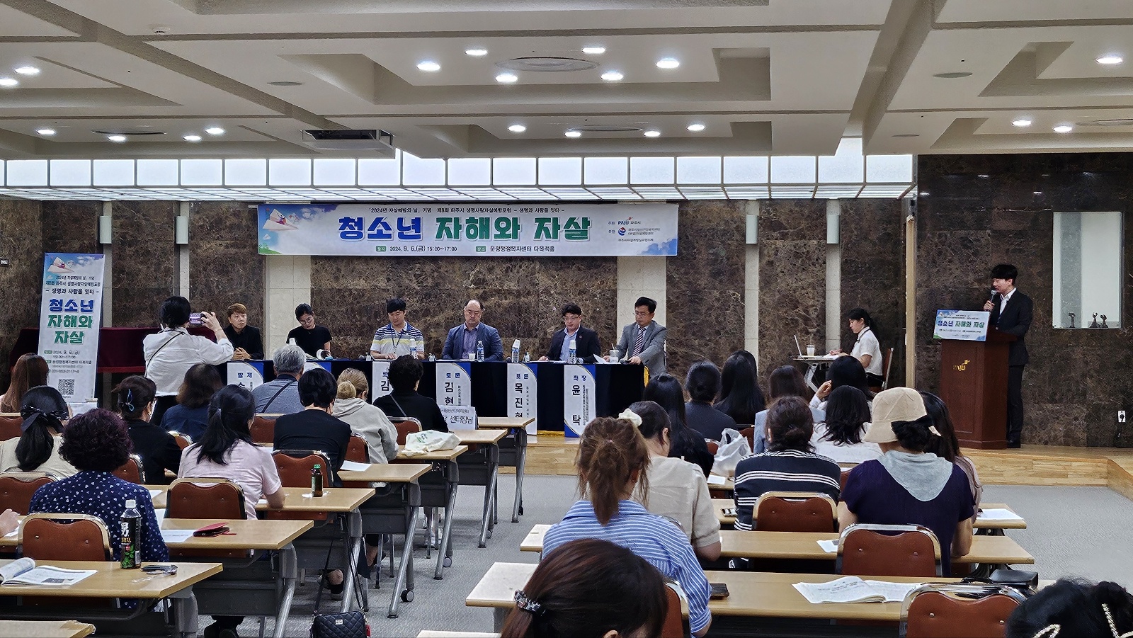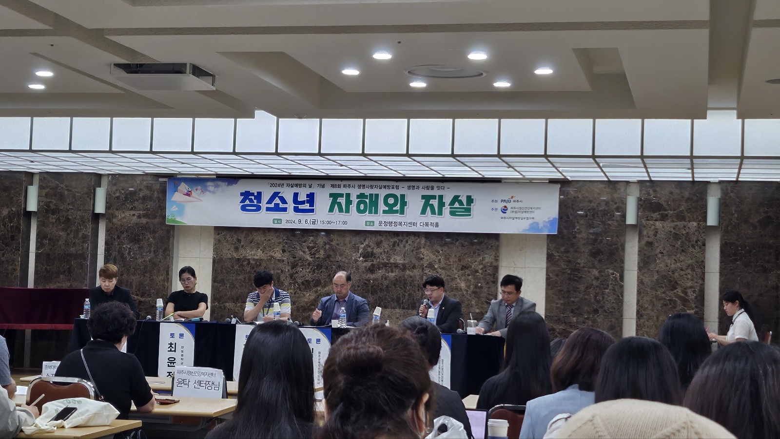 2024. 9.6.(금) 15:00~17:00 운정행복센터 다목적 홀에서 파주시가  주최하고 파주시 정신건강복지셴터에서 주관한  청소년 자해와 자살에 대한 포럼에 저희 사회복지행정과 1-3반 다수 참석해서 경청하였습니다.