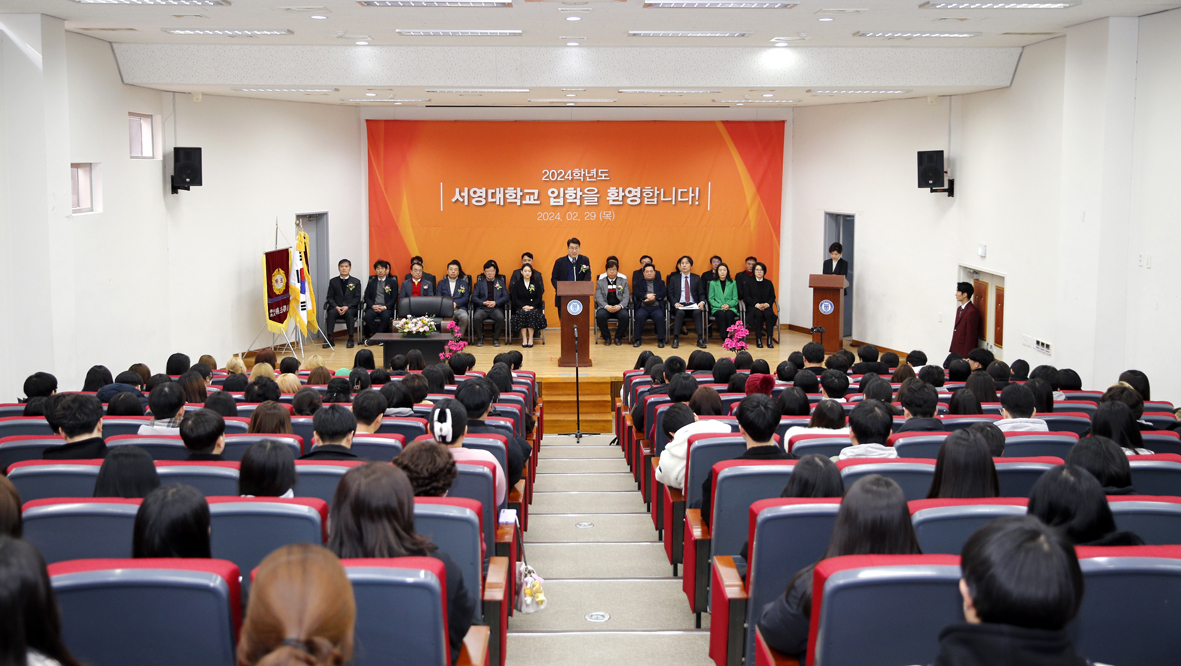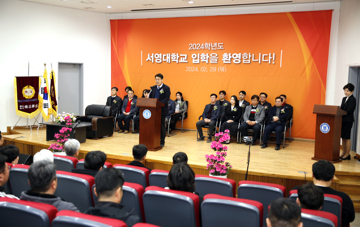 ○ 우리대학(총장 김정수)은 2월 29일(목) '2024학년도 서영대학교 입학식'을 개최하였다. 서영대학교 서강홀에서 진행된 입학식에는 김순곤 부총장을 비롯하여 학교관계자와 교직원 등 내빈과 신입생 및 신입생을 축하해주기 위한 축하객이 참석하였다. 이날 진행된 입학식에는 보다 많은 신입생들의 입학을 축하하고 기념할 수 있는 자리를 마련하기 위하여 주간반 신입생을 위한 주간입학식과 야간반 신입생을 위한 야간입학식으로 총 2차례에 걸쳐 행사를 진행하였다.