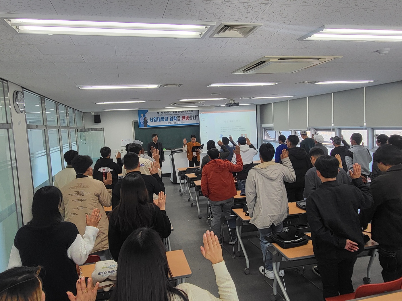 O. 한국어 교육과정의 첫 시작인 4월 7일(일)에는 한국어교육과정의 입학을 축하하기 위한 입학식을 진행되었다. ‘제1회 한국어교육과정 입학식’에는 참석자 소개를 시작으로 학생 대표자 선서와 참석자 환영사 및 강사소개 순으로 진행되었다. 앞으로 한국어 교육과정은 매주 일요일마다 1일 4시간씩 12주 간 진행될 예정이다.