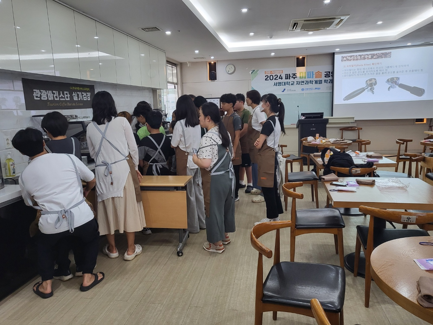 O. 우리대학(총장 김정수) 항공국제관광과(학과장 곽영대)는 '2024학년도 파주미파솔 공유학교 학과체험프로그램 커피바리스타 2급 자격증 체험반'을 개설하여 운영하였다. 서정관 호텔F&B(식음료)실습실에서 진행된 커피바리스타 2급 자격증 체험은 2024년 9월 21일 9시 30분부터 12시 40분까지 20명의 초중고학생들이 참여하였다.